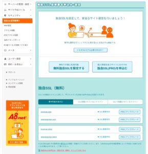 セキュリティメニューの「独自SSL証明書導入」を押し、更に画面中央に現れた「無料独自SSLを設定する」ボタンを押して下さい。