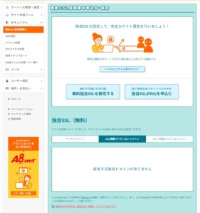 セキュリティメニューの「独自SSL証明書導入」を押し、更に画面中央に現れた「無料独自SSLを設定する」ボタンを押して下さい。